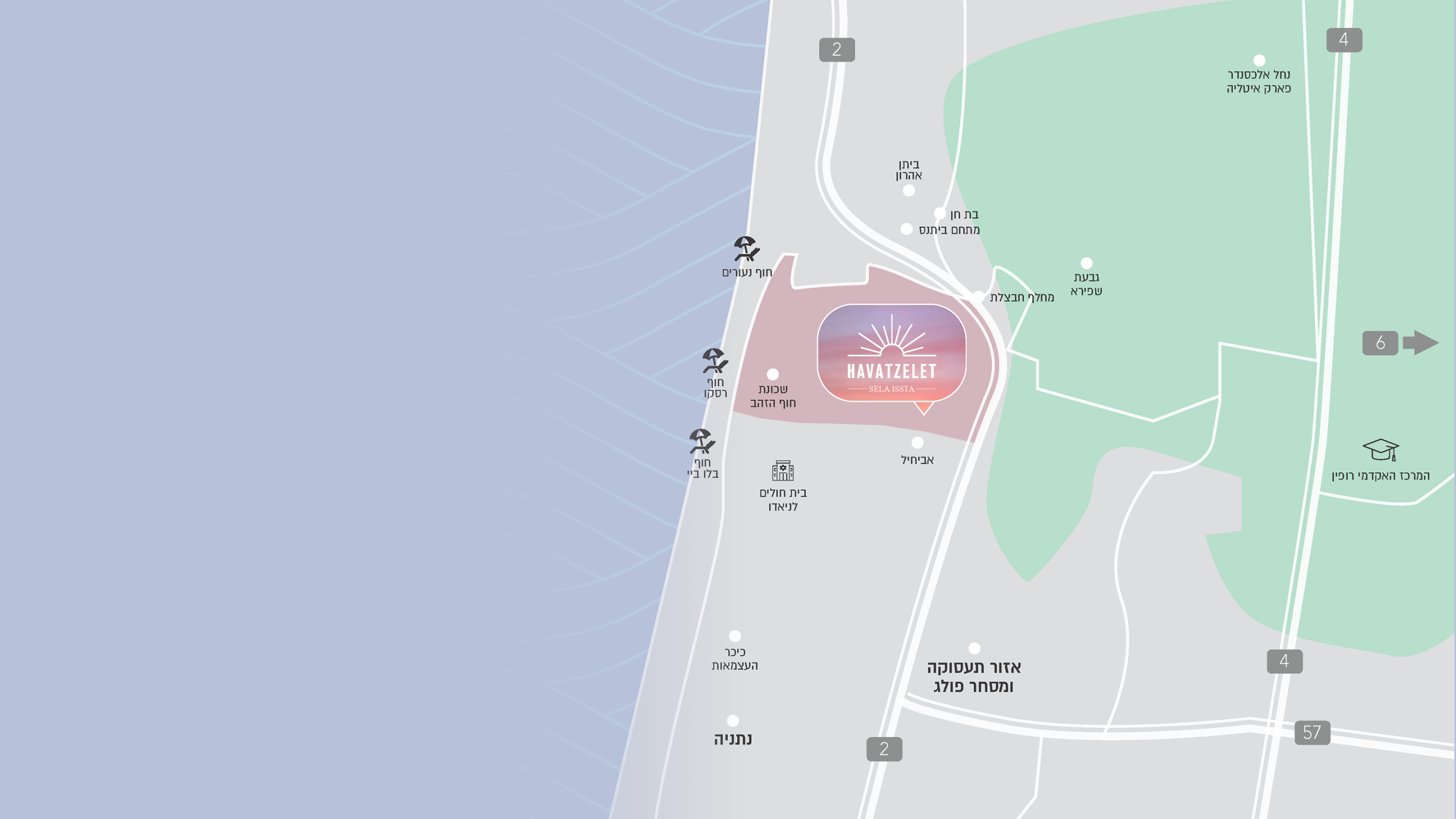 הפרויקט ממוקם על אחת הנקודות הנוחות ביותר באזור: מחלף חבצלת החדש נמצא ממש בכניסה לשכונה המחבר אתכם ישירות לכביש החוף בלי לעבור דרך העיר. תחנת הרכבת של נתניה במרחק נסיעה קצרה, ודרכי גישה מהירות ליעדים כמו תל אביב, הרצליה וחדרה הופכות את כל הסביבה לנגישה וזמינה. זאת נוחות שלא שומעים עליה, מרגישים אותה בכל בוקר מחדש.