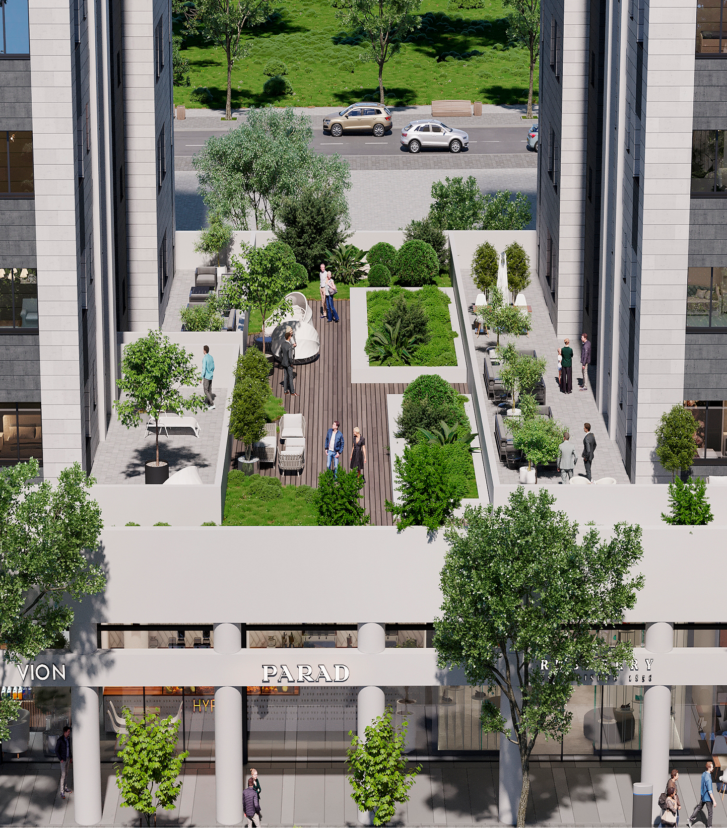 בין שלושת הבניינים, ממש מעל קומת המסחר, מחכה לכם הלב הפועם של חיי הקהילה: גינת שחקים רחבה וירוקה, שתוכננה להיות הרבה יותר מעוד שטח ציבורי. היא משלבת שבילים נעימים, פינות ישיבה מוצלות ושטחים פתוחים ויוצרת מרחב מחבר בין הדיירים, כזה שמזמין לרגעים של שקט, משחק או מפגש אקראי. גינת השחקים מעניקה תחושת גינה פרטית בלב המתחם, ומאפשרת גם לדירות עם גינה ליהנות מקשר ישיר אליה. מעבר לה, עוטפת את הפרויקט מעטפת ירוקה הכוללת שבילים מוצלים ושני פארקים רחבי ידיים – שנמצאים במרחק הליכה קצרה.